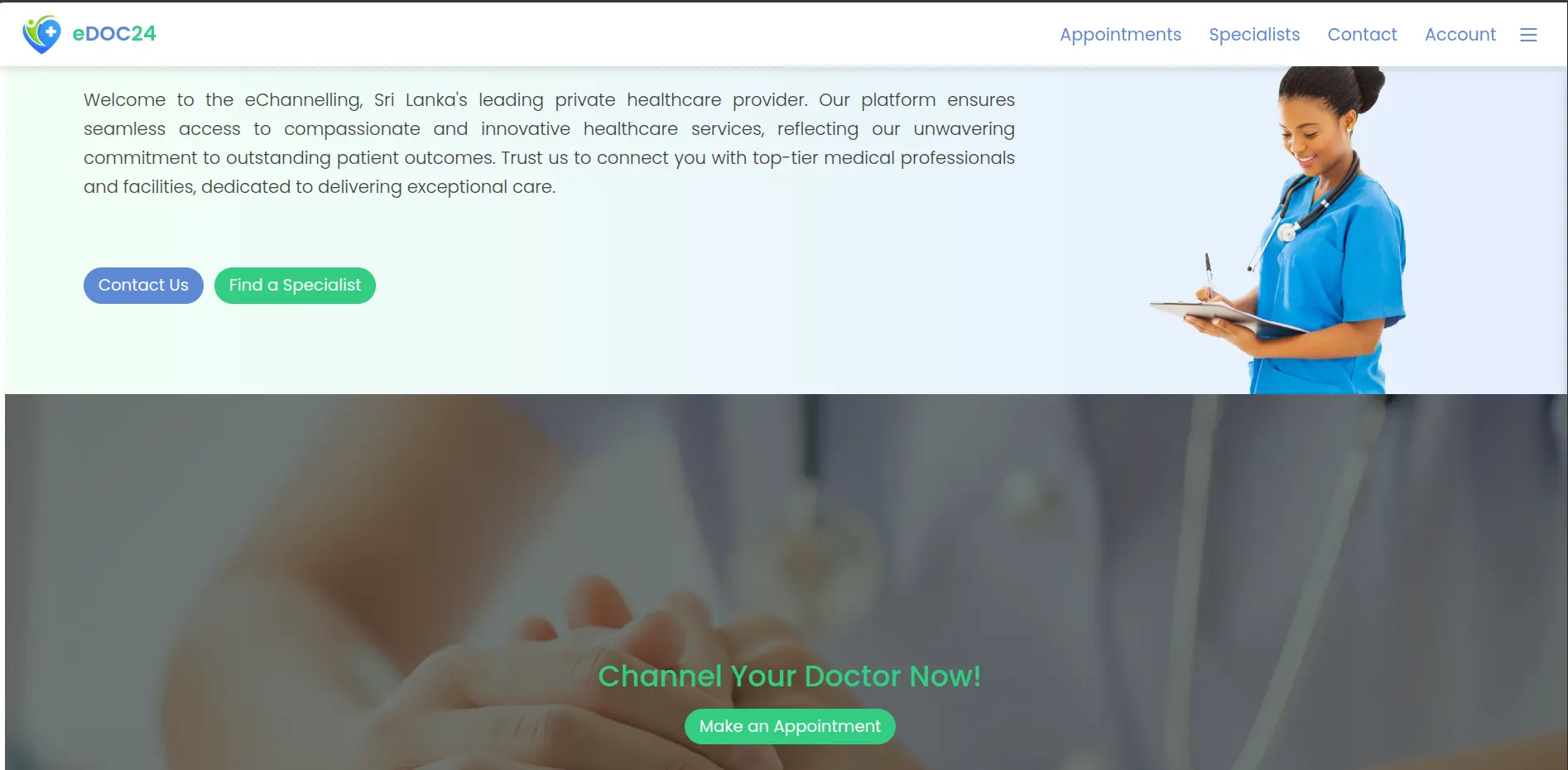 A web-based frontend for an E-channelling system that allows patients to book appointments with doctors online, view available time slots, and manage their bookings.